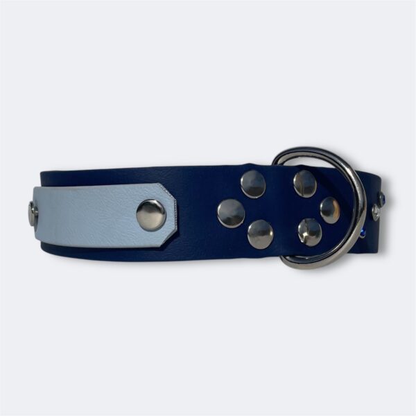 Fabriqué à la main en Biothane de 38 mm, il offre robustesse, confort et personnalisation, avec une finition soignée par rivets décoratifs.