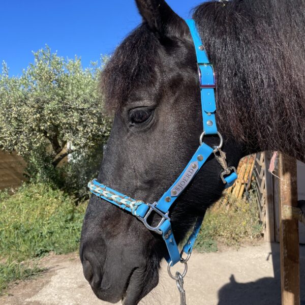 • Plaque de Biothane Gravée : Personnalisez votre licol avec une plaque gravée. Nom de votre cheval, le vôtre, ou un message spécial – cette personnalisation apporte une touche d’originalité à votre équipement équestre.
